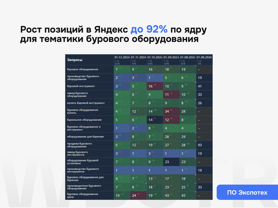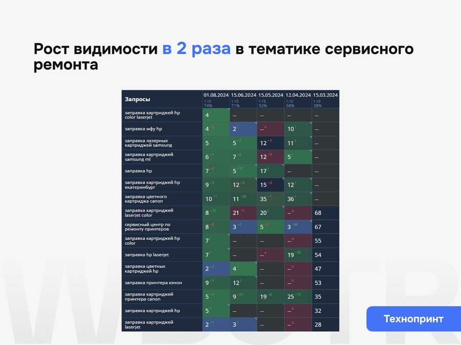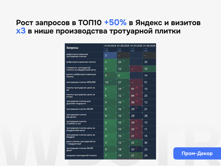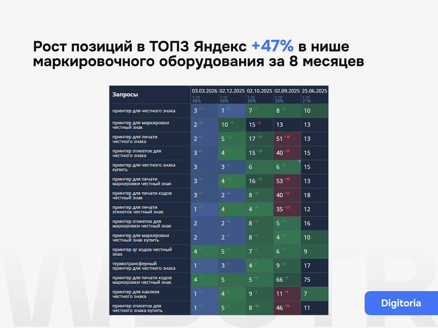 Мы не даём формальных гарантий по позициям — это запрещено политикой поисковиков. Но мы обеспечиваем контроль за результатами, прозрачную аналитику и корректировку стратегии при необходимости.